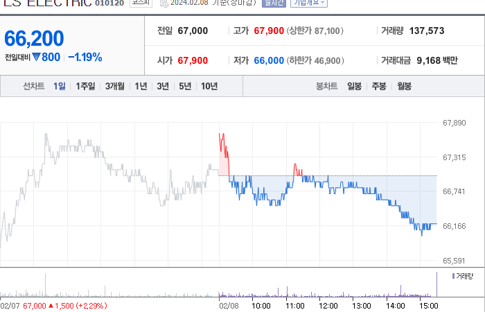 LS ELECTRIC의 현재 주가는 67,000원으로, 전일 대비 -10.19원 하락하였습니다. LS ELECTRIC의 주주현황을 살펴보면, 이 회사는 지분의 47.47%를 소유하고 있습니다. LS ELECTRIC은 전기장비 기업으로, 현재 주가는 67,000원이며 시가 총액은 1조 9860억 원입니다. 발행 주식수는 30,000,000주이며, 외국인 보유 비중은 16.21%입니다. 장중 거래량은 140,836주를 기록하였으며, 매출액은 32,001억 원입니다.